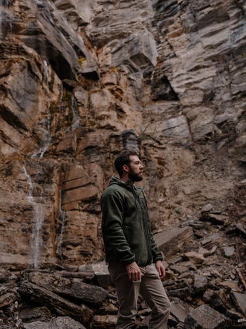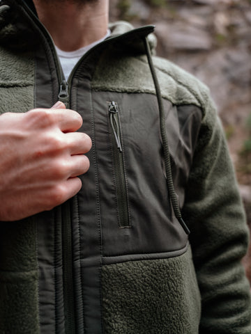 - Heavy full-zip fleece with a drawstring hood